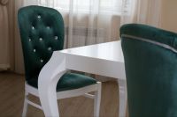 В комплект гарнитура входят: Стол "Quantum" Белая матовая столешница с ультра глянцевыми ножками, и 4 стула "Олеся Р3Н" с мягкой спинкой в ткани Бархат.