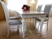 Она состоит из стола Рино-1 1600*900*782 в белом цвете и Стульев Р2В - 550*970*500 в белом цвете без патинирования, ткань №19 Шахеризада в количестве 4-х штук.
